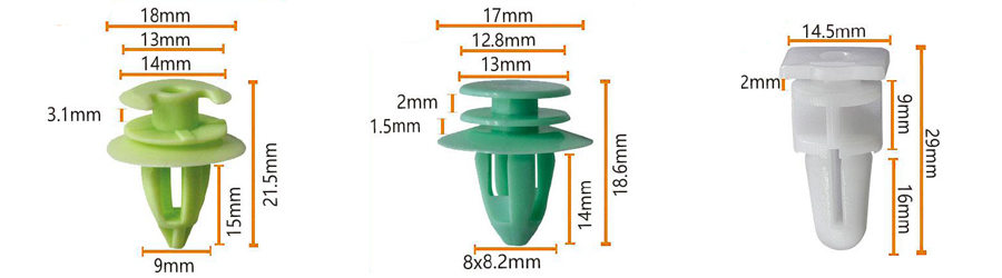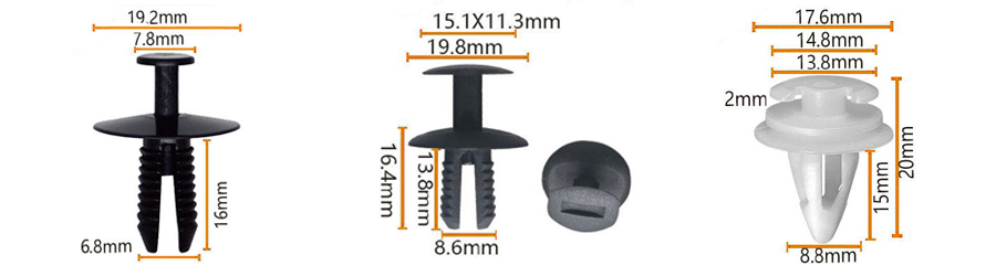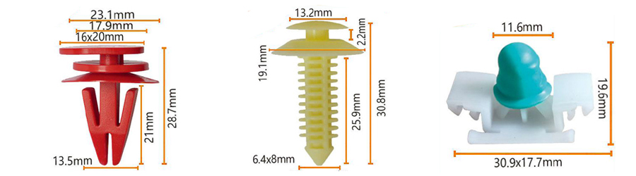Plast fljótt losunarklemmur: Notað til að laga líkamsplötur, stuðara, hjólbogfóðringar og svo framvegis. Þessar klemmur eru venjulega gerðar úr háhitaþolnum, hástyrkjum plasti og eru hannaðar með skjótum losunaraðgerð, sem gerir það auðvelt að gera við eða skipta um hluti.